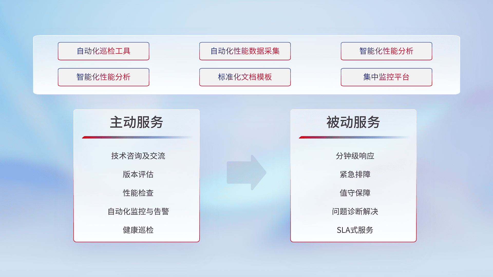 智能化工具和标准化文档,,,,保障服务质量,,,提供主动服务(包含技术咨询、、、、版本评估、、性能检查、、、自动化监控与告警、、、、健康巡检)和被动服务包含(分钟级响应、、、、紧急排障、、值守保障、、问题诊断解决、、SLA服务)。。。。